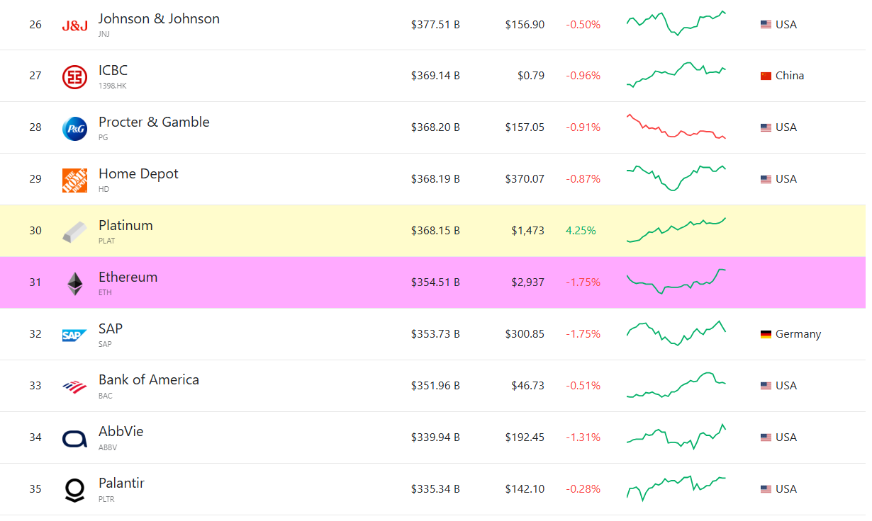 本周第二大加密货币同样迎来复苏,自二月以来首次突破3000美元关口。其350亿美金市值已跻身全球资产前30强,超越美国银行和SAP等巨头,下一个挑战对象将是市值近3700亿的铂金。