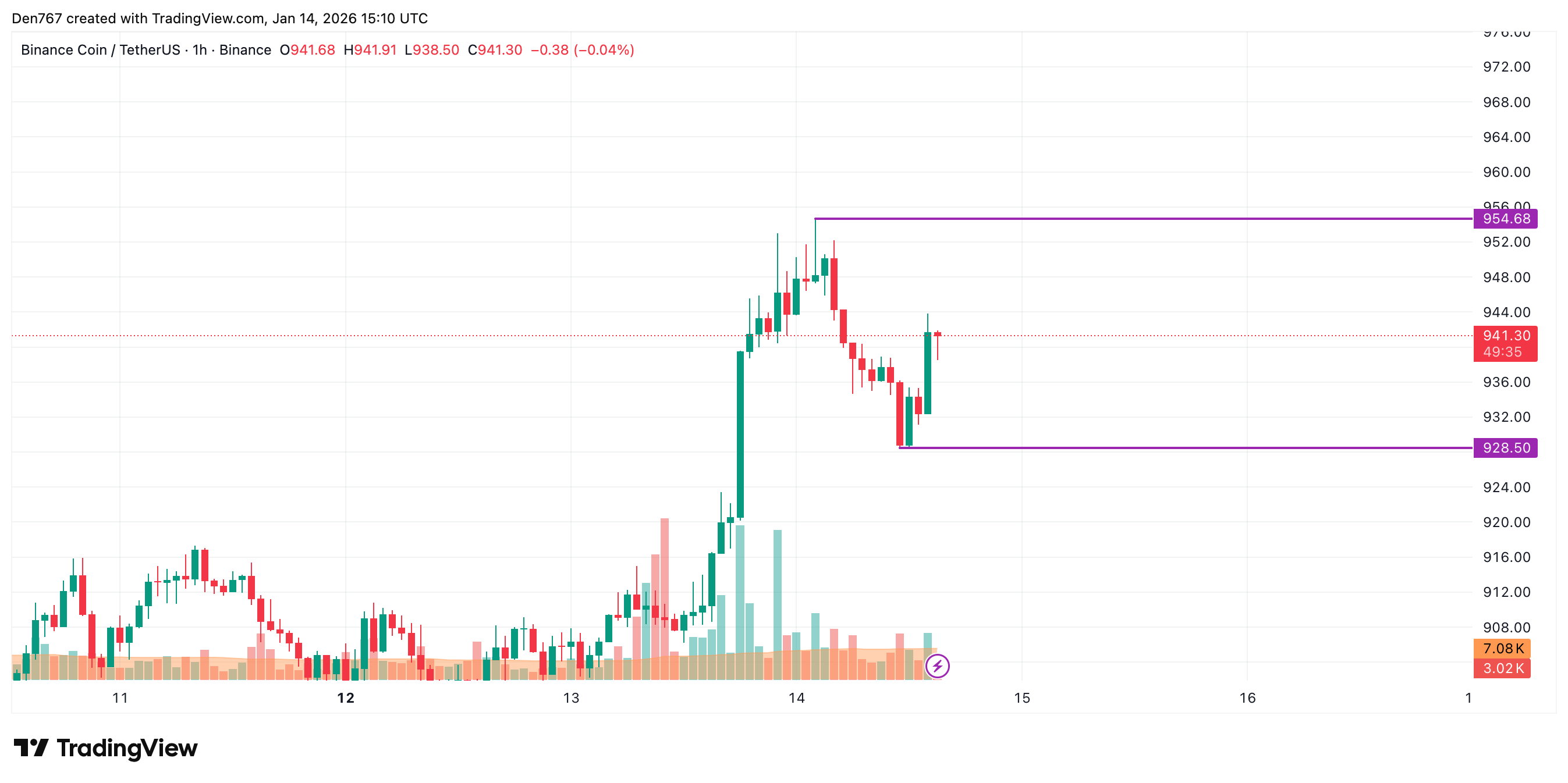 当前BNB价格位于928.50美元支撑位与954.68美元阻力位构成的局部通道中轨。由于日内大部分平均真实波幅已消耗完毕,明日出现剧烈波动的可能性较低。