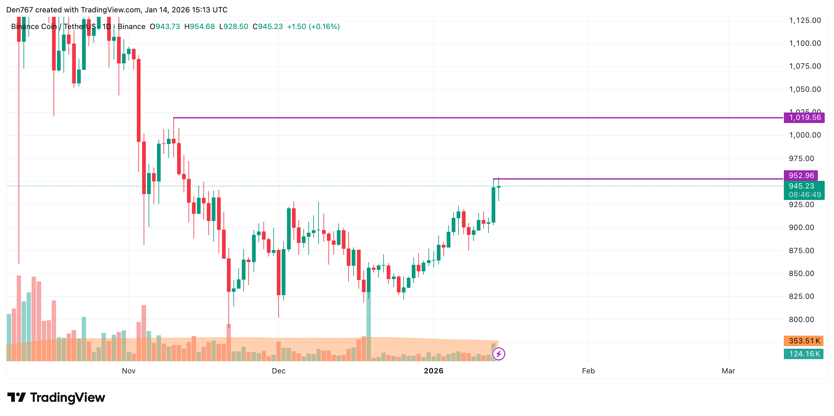 截至发稿时,BNB交易价格为944.89美元。