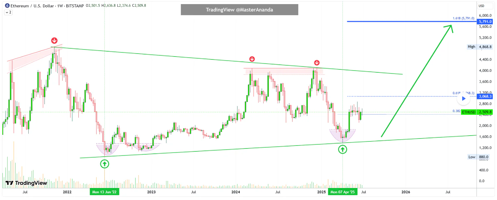 阿南达指出2025年4月将成为转折点——当时ETH在2,425美元支撑位形成圆弧底形态,并在短暂下探后迅速收复该关口。他表示,这一走势标志着自2024年3月开始长达一年的熊市趋势正式终结。