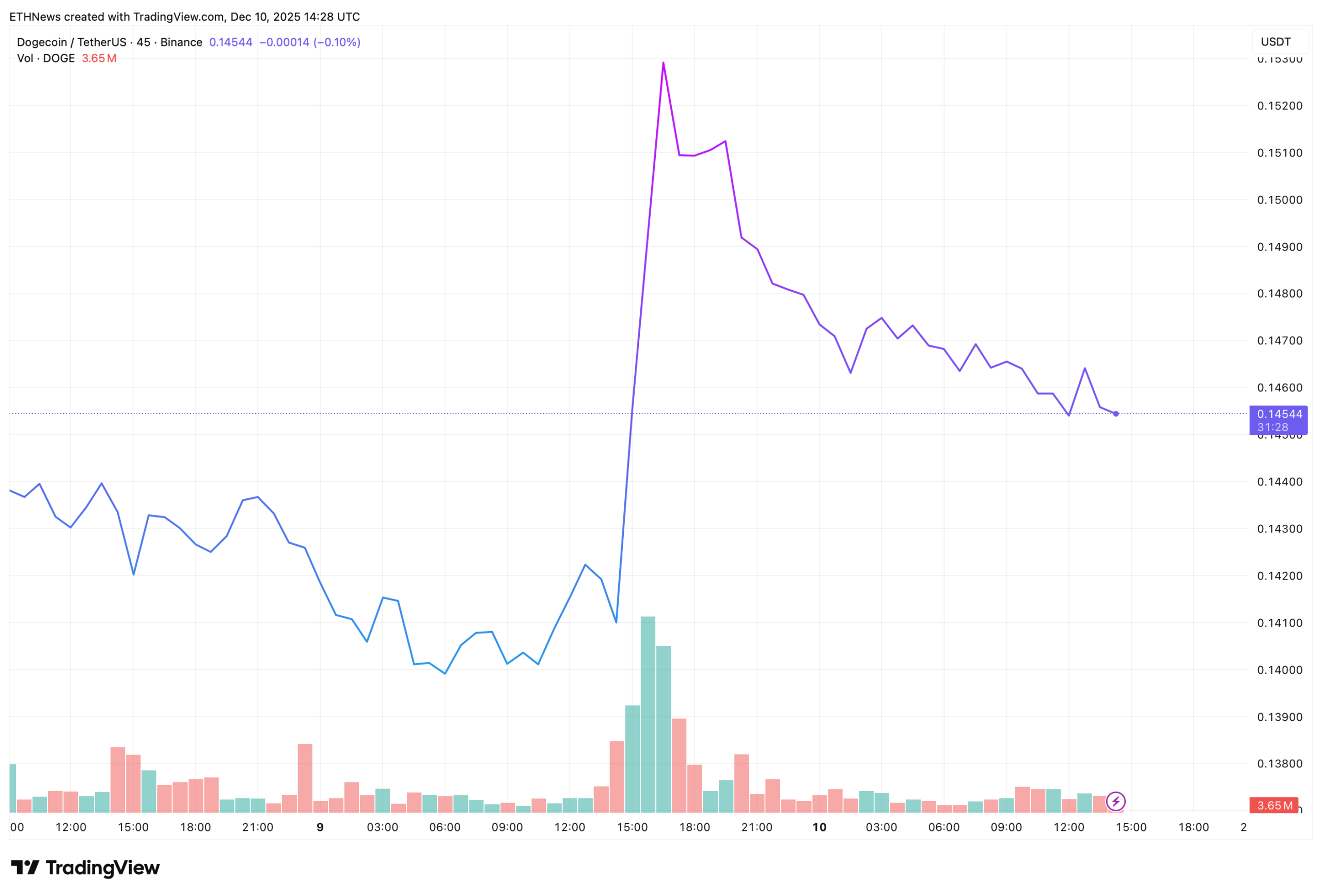 突然的垂直拉升使DOGE脱离低点,显示流动性激增与短期需求爆发