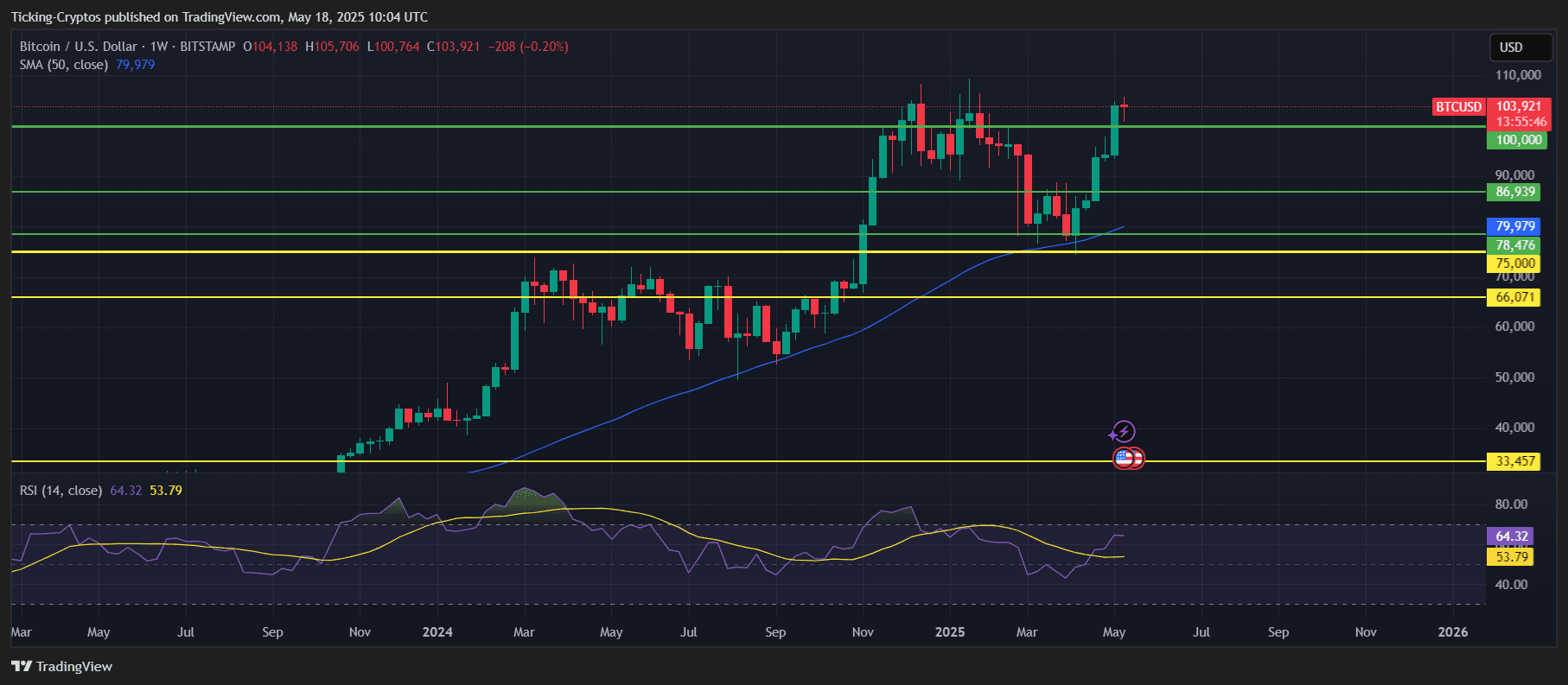 50周SMA位于79,979美元,强化了比特币强劲的长期看涨趋势。由于BTC舒适地交易于主要移动平均线之上,技术前景仍然非常积极。