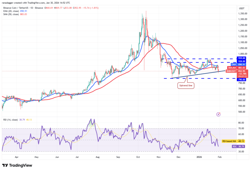 在其他主要资产中,BNB的技术格局指向微妙的平衡。价格在未能维持在890美元附近的20日EMA上方后下跌,滑向作为关键支撑的上升趋势线。若收盘跌破该线,可能打开测试790美元水平的大门,进一步跌破则可能跌向730美元。反之,若从上升趋势线反弹,则表明买家在回调时依然活跃,可能推动代币上探928–959美元阻力带,历史上空头常在该区域重新控盘。