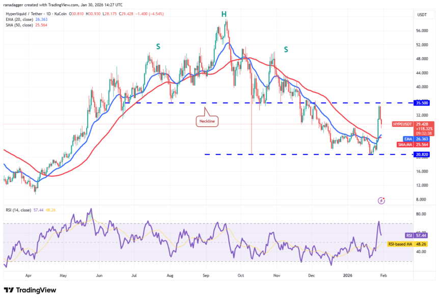 Hyperliquid在远离破位水平后,交易于35.50美元关键阻力附近,表明空头正坚定防守该水平。26.36美元附近的20日EMA构成关键基线;从该线反弹可能重燃上攻35.50美元上方的动能,并为上探44美元区域铺路。反之,若跌破移动平均线,可能引导价格进入35.50美元至20.82美元之间的长期整理,若形态持续,则为潜在下跌趋势的延续创造条件。