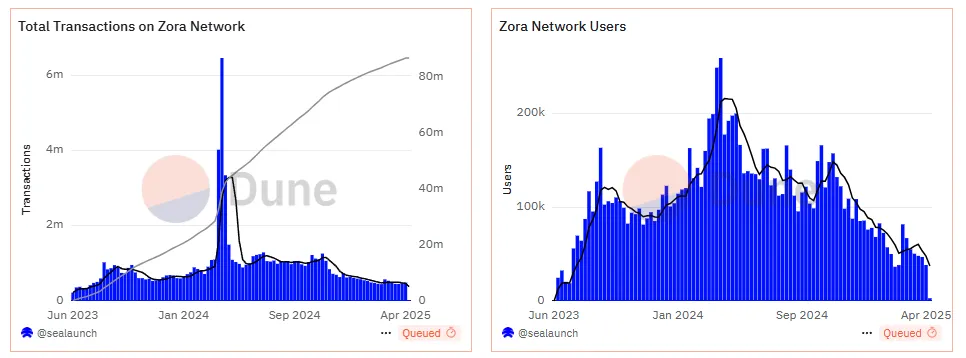 截至发稿时,数据显示Zora Network已处理超过8700万笔交易,目前每天吸引约37000个活跃地址。然而,用户活跃度大幅下降,过去一年活跃用户数量减少了80%以上。
