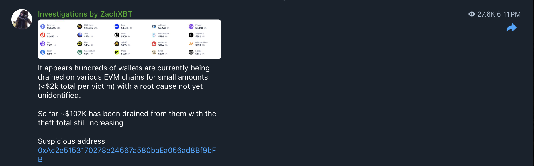 ZachXBT指出,单个钱包的损失金额相对有限,每位受害者损失均低于2000美元。该活动已影响多个EVM兼容网络的钱包,表明这是一起广泛分布的安全事件,而非局限于单一区块链。