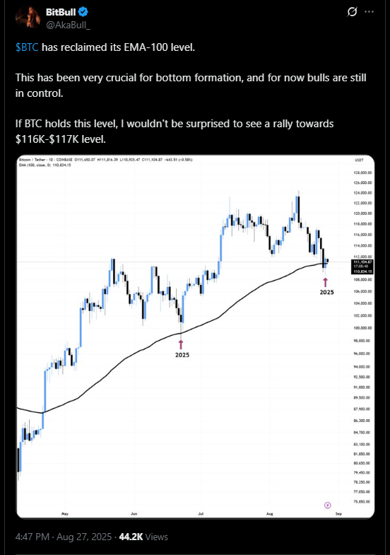 比特币(BTC USD)价格从10.95万美元附近的低点回升后,日内高点触及11.3万美元。此番反弹发生在该代币重新站上100日指数移动平均线(EMA-100)之后——该11.1万美元附近的技术位被许多交易员视作关键支撑。