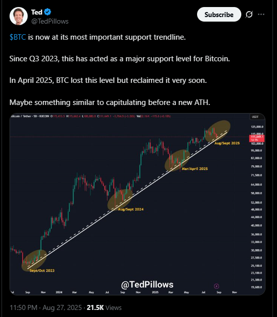 分析师TedPillows近期关于比特币重测关键趋势线的观点引发交易员广泛关注。市场观察人士将机构兴趣回升与美国证券交易委员会(SEC)可能推出加密友好政策的猜测相联系。