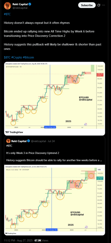 市场评论员Rekt Capital认为当前回调与早期牛市修正形态相似,预计本次调整周期将更短且更温和。