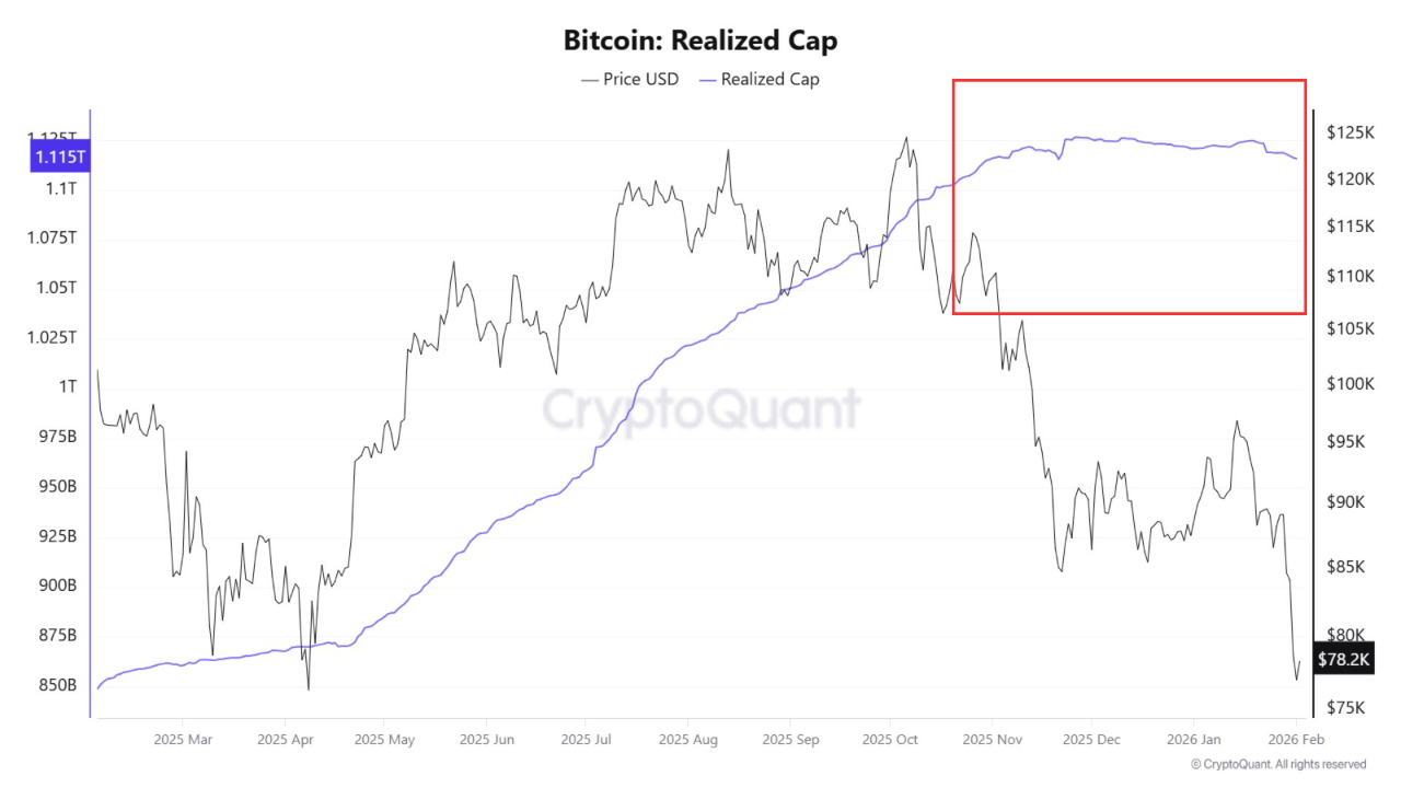 尽管近几个月价格波动显著,但实现市值的增长已陷入停滞。该指标追踪网络上所有比特币的聚合成本基础。平缓的增长表明现有持有者正在相互交易,而非新资金流入。