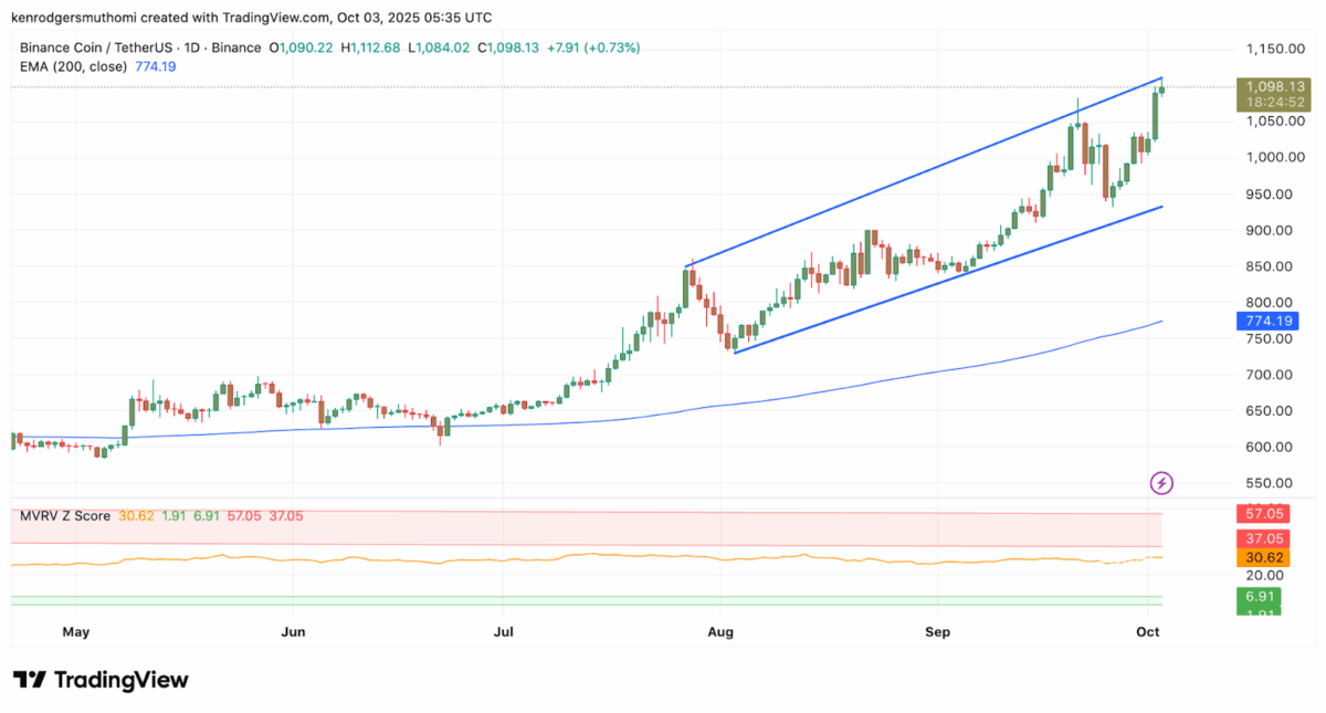 200日指数移动均线(774美元)构成长期支撑,且MVRV Z-Score等估值指标显示BNB尚未进入超买区间,上涨行情或可持续。分析师Henry在X平台发表观点称:"看涨旗形已完成突破,目标位指向1200美元历史新高,我们已近在咫尺。"