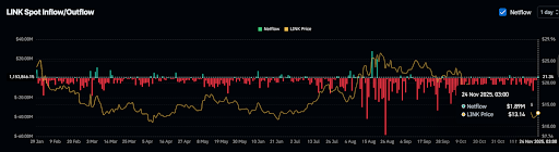 4月下旬出现显著变化,净流动开始呈现更稳定态势,资金流入持续超过流出。这种净流动变化支撑了Chainlink价格上涨,8月初一度突破25美元高点。然而8月后,资金流入流出开始趋于平衡,净流动呈现小幅下降趋势。Chainlink价格跟随相似走势,逐步下跌至2025年11月24日的13.14美元。11月净流动虽保持正值但动能减弱。
