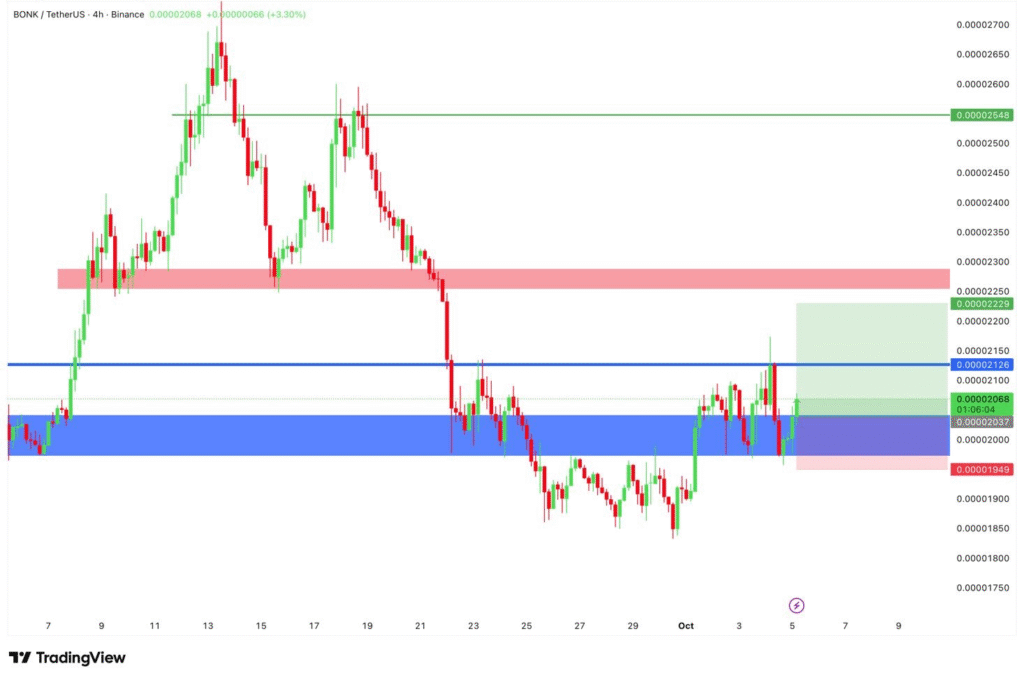 若$BONK能维持在0.00002000上方,可能向0.00002229阻力位推进。突破成功后,下一目标可能是0.00003000,创下该加密货币的新高。