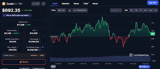 截至发稿时数据显示,Zcash现报692.35美元,24小时涨幅1.5%。随着交易所活跃度提升,总市值达112.9亿美元,期间成交额43.4亿美元显示参与度持续扩大,完全稀释估值维持145.3亿美元。