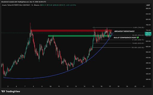 技术分析师Ardi指出,Zcash在收复520-540美元供应区后已进入明确上升结构。图表显示价格突破611美元确认区域后强势挺进740美元附近高点,目前稳守684美元"多头信心点"上方——该位恰逢近期趋势线突破后的38.2%斐波回撤位,形成重要支撑汇合区。