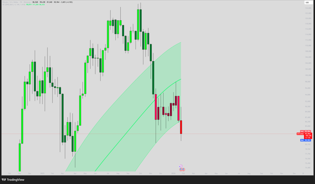 在周线时间框架上,比特币正测试高斯通道的下沿。该区域位于82,000美元附近,被视为结构的最后一道重要支撑。若周线蜡烛收于此水平下方,跌破可能为更深的下跌打开大门。