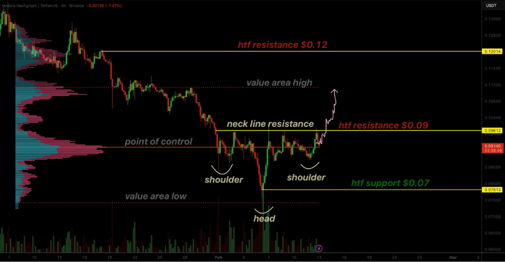 0.09美元已成为HBAR的关键阻力位,价格正逼近重要转折点。若该区域上方出现决定性突破,不仅能确认倒头肩形态的成立,还可能预示市场主导权的转变。此阻力位与高时间框架的重要阻力水平重合,进一步提升了该价位的战略意义。