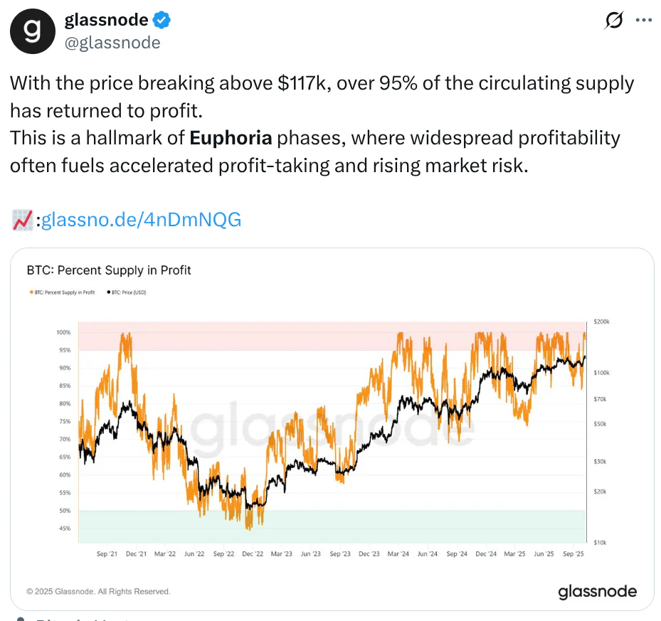 对普通投资者而言,这种普遍盈利究竟意味着什么?Glassnode链上数据揭示关键信号:当供应端绝大多数处于盈利状态时,往往预示着分配周期的开始。