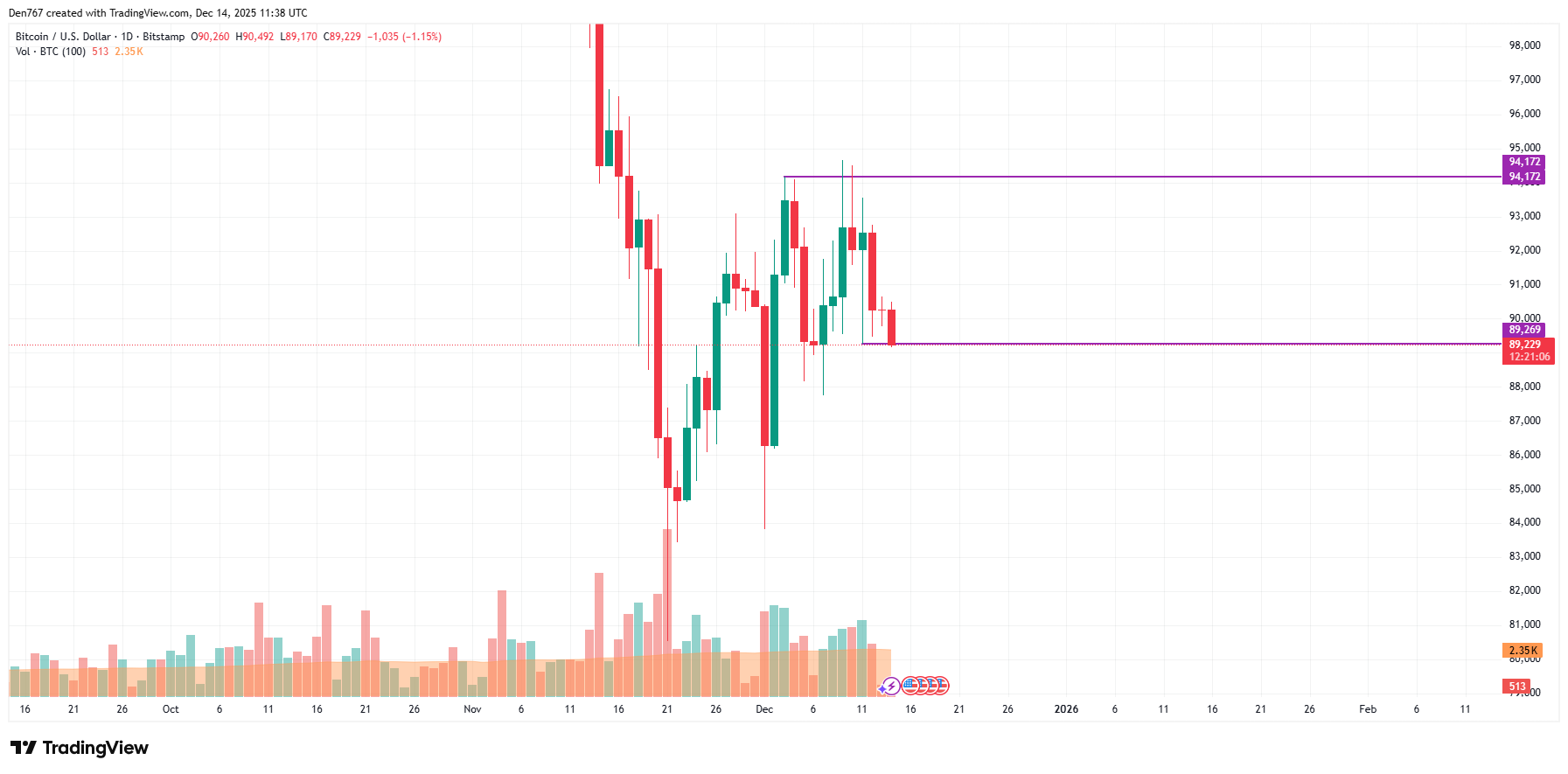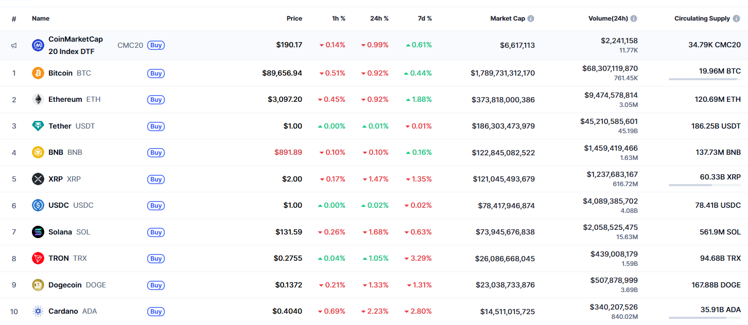 截至发稿,比特币交易价格为89,298美元。