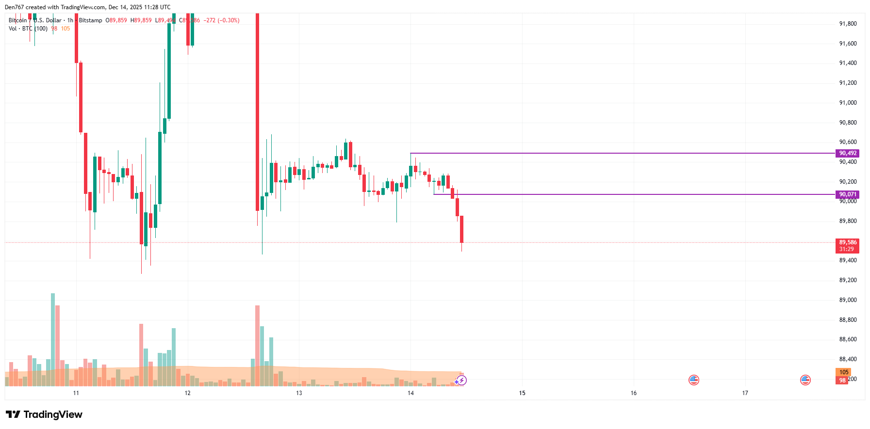 在小时图表上,BTC价格在突破90,071美元局部支撑位后持续走低。若跌势延续且日线收盘价低于90,000美元临时区间,则极有可能下探88,000-89,000美元区间。