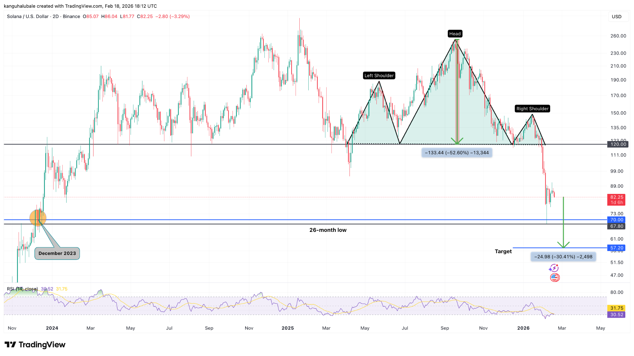 Solana近期跌势使其价格失守关键支撑位,周线图确认形成头肩顶形态。加密货币分析师Bitcoinsensus分享的图表显示SOL已验证该形态,暗示后续可能进一步下行,“下一支撑位约位于50-60美元区间”。