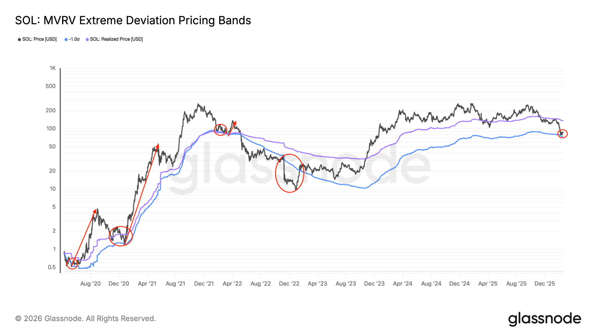 历史数据显示,SOL价格往往在触及或跌破MVRV最低波段后出现显著反弹,例如2022年3月测试75美元附近最低偏离波段后,三周内上涨87%至140美元。类似反弹亦出现在2022年6月初及2020年12月。