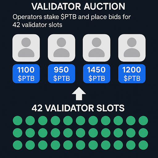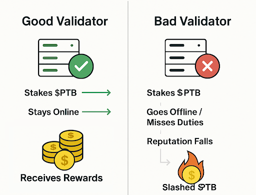 验证节点质押的$PTB同时作为行为担保。系统通过线上时长、参与签名广播等指标建立动态声誉评分:长期稳定运行的节点可保留活跃席位并获得奖励;离线或未履行职责将导致声誉值下降,当转为负值时触发$PTB罚没机制。