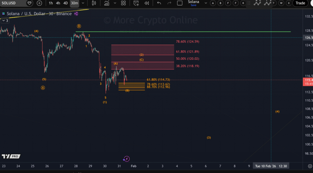 若Solana价格跌破112美元,可能确认(2)浪终结,预示跌势或将延续。当前回调水平显示未来数小时对判断Solana能否维持当前位置至关重要。