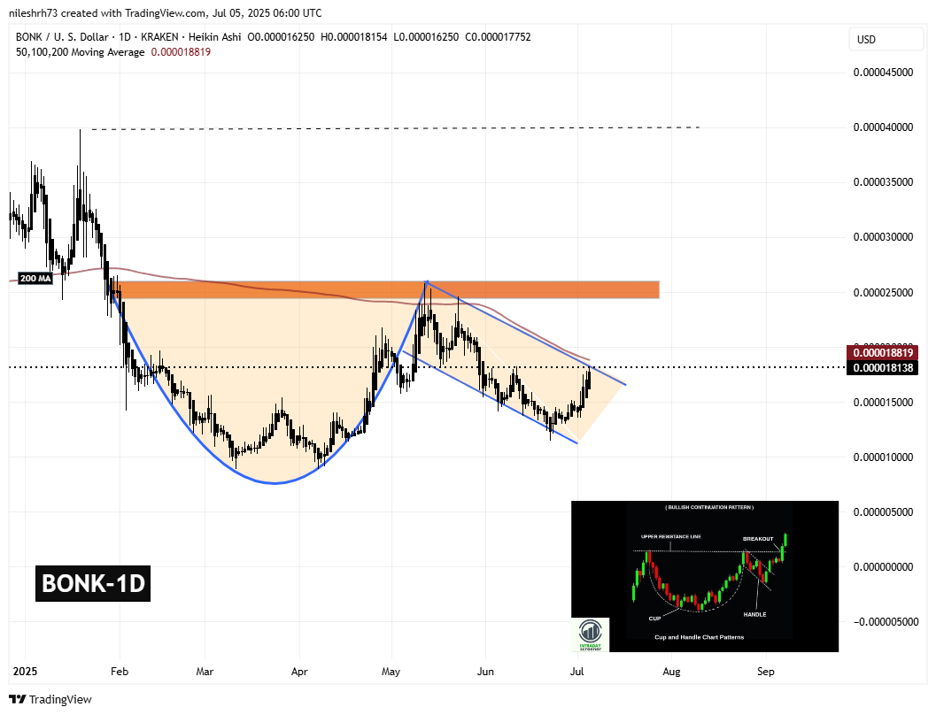 日线图表显示,BONK正在形成教科书般的杯柄形态,这种看涨中继结构通常预示着突破行情。该形态的圆弧状杯体形成于2月至5月期间,对应BONK触底回升阶段;5月下旬至7月初则构筑出略微下倾的柄部整理区间。