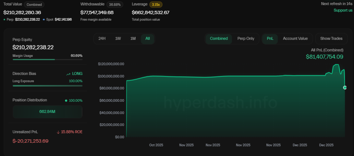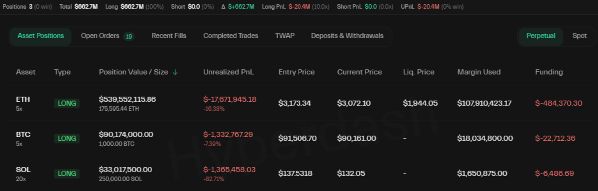 根据链上分析平台HyperDash数据,这位资深交易员除比特币外,还做多了以太坊和Solana。其5倍杠杆的以太坊头寸价值5.39亿美元,当前未实现亏损达1760万美元;价值9000万美元的比特币头寸同样采用5倍杠杆,未实现亏损为130万美元;此外他还持有3300万美元的SOL 20倍杠杆多头头寸,未实现亏损130万美元。