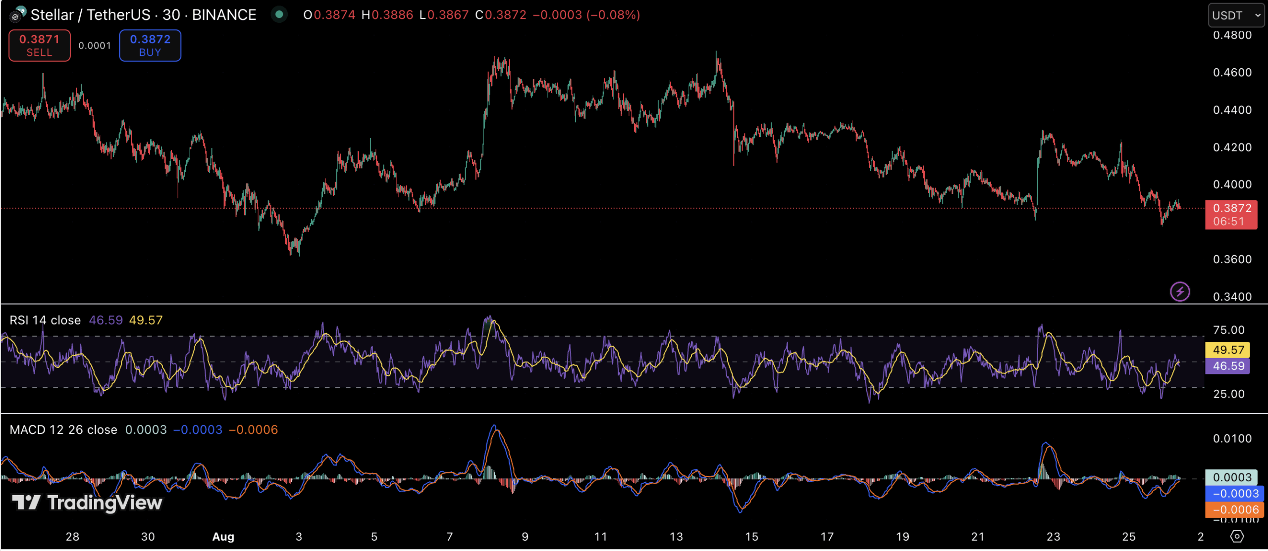 相对强弱指数(RSI)停留在46.59附近,徘徊于中性区域下方,而MACD指标保持平缓,表明交易者处于观望状态。从更宏观的图表来看,XLM始终难以站稳0.40美元关口,多次遇阻回落暗示上涨动能不足。