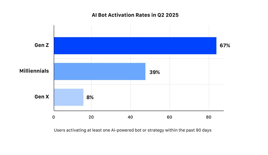 2025年第二季度行为智能报告表明,过去90天内三分之二的Z世代用户启用了至少一个规则化交易策略。但AI的应用远不止于部署交易机器人——22.1%的年轻用户每月使用AI工具达四次以上。