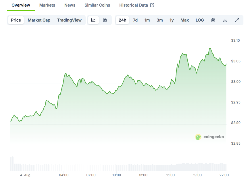 XRP近期逆势反弹,3美元价位如同磁石般吸引护盘资金。CoinGecko数据显示,XRP现报3.04美元,24小时涨幅4.39%。BitGuru指出,价格在触及3.6561美元后进入修正阶段,随后在3.00-3.30美元窄幅震荡,当前突破标志着明确上升趋势的回归。