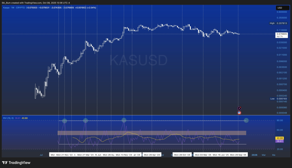 该周线图展示了KAS/USD走势及下方的RVI(10)指标。RVI清晰呈现三个区间: