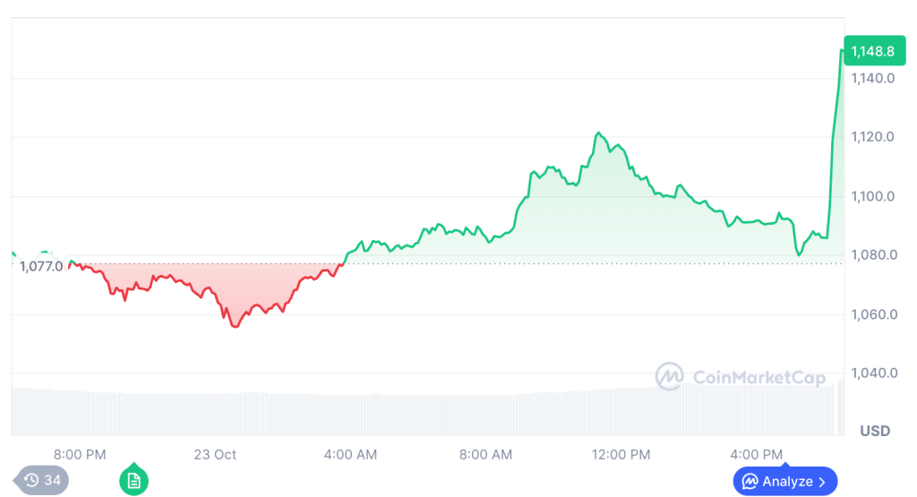 特赦消息直接刺激币安平台币BNB快速拉升,24小时内上涨5.18%至1,148.8美元,显示投资者信心回升。其市值增长5.08%达1,570.49亿美元,交易量激增14.04%至47.1亿美元。强劲反弹反映出市场对币安监管合规及运营前景的预期改善。