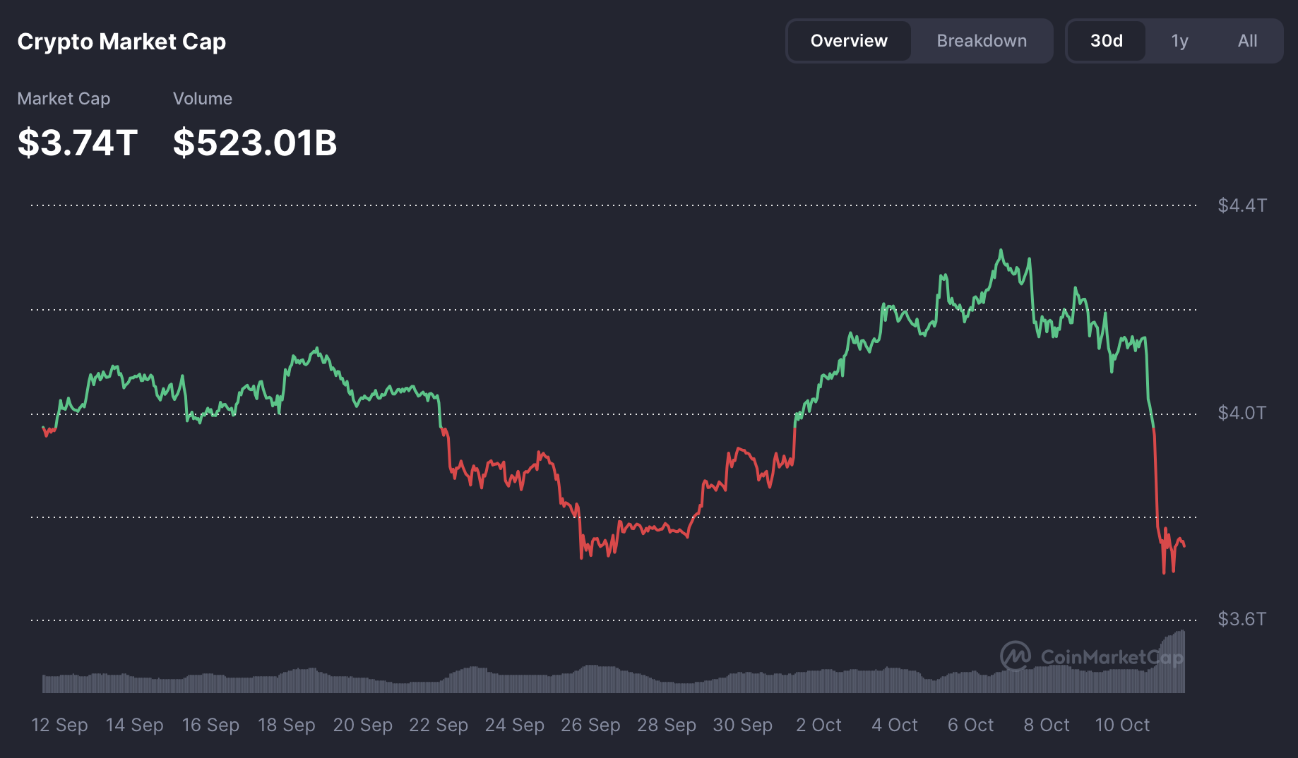 据CoinMarketCap数据显示,加密货币总市值24小时内暴跌9.45%,跌至3.74万亿美元。追踪前200大加密货币的CMC200指数同步下挫9.66%,反映出市场全面抛售的态势。分析人士指出,这种同步下跌源于交易员对贸易紧张局势升级可能引发全球经济放缓的担忧,导致风险资产被集中抛售。