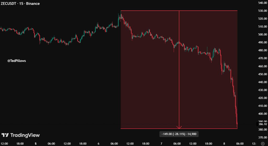 图表中的阴影区域凸显了本轮波动的幅度:ZEC价格从530美元低点附近跌向386美元区域,跌幅约28%。如此波动绝非正常回调,更似流动性枯竭引发的清算式抛售——价格必须大幅下跌才能寻获买盘。