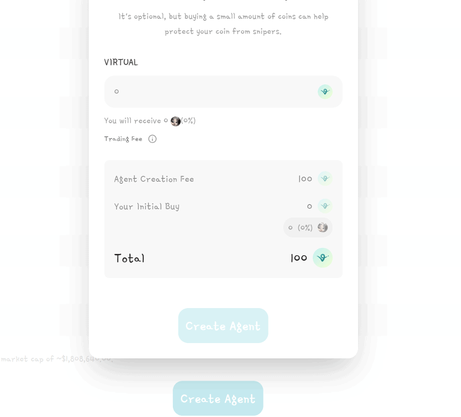 2. 第二步是存入VIRTUAL代币;用户需要至少100 VIRTUALS代币来创建代理,它们将在绑定曲线上列出,用户可以在其中交易他们的代币。