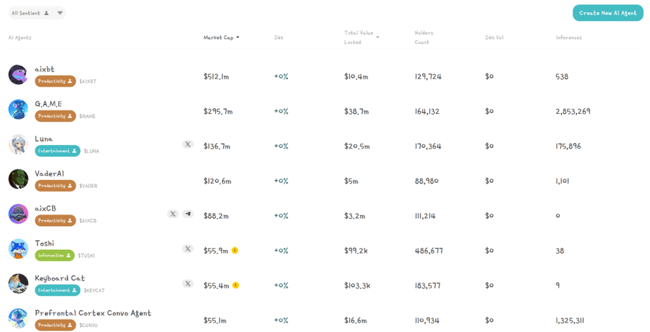 那么,Virtuals Protocol 在其中扮演什么角色呢?一些用户经常将其视为AI和迷因币的Pump.fun(甚至界面都相似),因为用户可以用更低廉的价格启动自己的AI项目,考虑到从头创建和启动一个AI代理会花费很多钱,尤其是如果它包括深度学习、强化学习、实时决策和其他功能。
