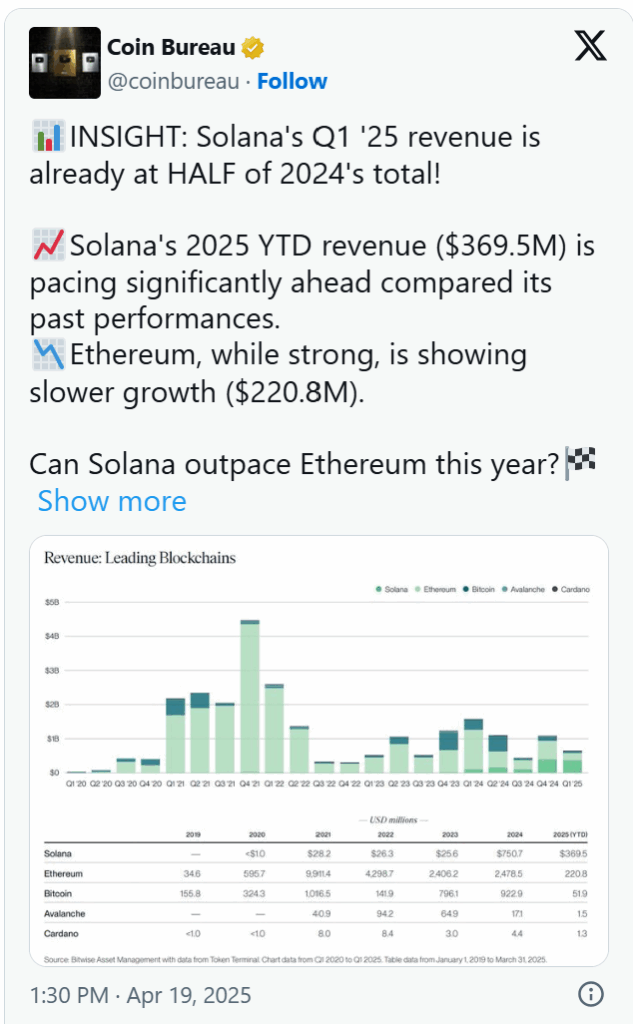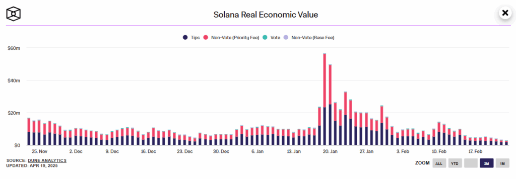 尽管Solana的价格走势在第一季度与大多数代币一样遭受了巨大的看跌打击,但其网络表现的某些方面仍然显示出强劲的势头。例如,该网络在第一季度仍然产生了可观的收入,大约占其2024年总收入的一半。
