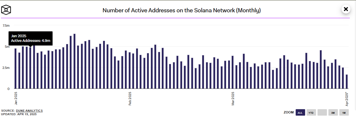 具体来说,Solana的每日活跃地址在1月份达到了650万个的峰值。根据最新数据,这一数字已降至约167万个。尽管如此,即使情况已经降温,该网络仍然继续表现出显著的活动。活跃地址的下降反映了外部宏观经济的影响。