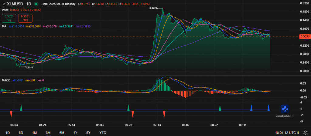 若价格能维持在斐波那契回撤位上方,XLM的看涨结构将保持完整;若跌破该支撑位,则可能引发更深度的回调。已确认的牛市旗形形态显示,即使没有外部催化剂,只要动能积聚,仍有显著上涨空间。紧凑的移动平均线和平缓的MACD指标表明,价格即将迎来决定性突破,0.40美元为近期阻力位。