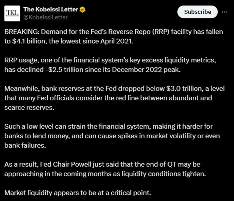 鲍威尔的判断源自银行准备金下降、美联储逆回购工具规模萎缩等最新数据。