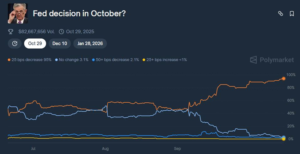 自九月以来,分析师普遍预测2025年底前至少会有三次降息。近期关于终止量化紧缩的讨论更进一步强化了这种预期。数据显示,10月底前降息25个基点的概率已飙升至95%,但降息50个基点以上的可能性仅为2.2%。