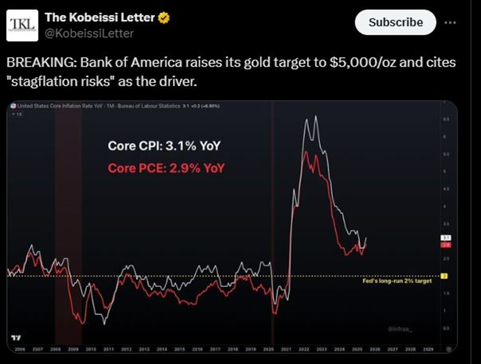 这种担忧已促使投资者增持黄金避险,美国银行最新报告更是直接承认滞胀风险并上调金价目标。