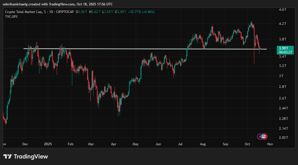 连续四天的日线收阴使加密市场总市值一度跌至3.45万亿美元低点。首要反弹动因来自趋势衰竭——空方不愿突破关键支撑位。例如,抛售浪潮在8月支撑位附近明显减弱,该位置在过去多次扮演阻力位角色。