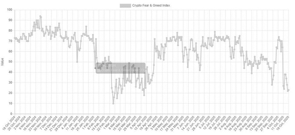 今日反弹的另一重要推手是市场情绪转变。本周收官时,恐惧与贪婪指数已跌入"极度恐惧"区间,周五最低触及22点(观测时小幅回升至23点)。市场情绪上次如此低迷还要追溯到2025年4月。