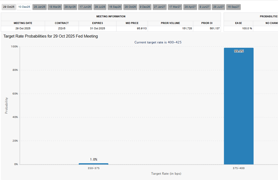 尽管上述因素共同促成了小幅上涨,但今日反弹的核心驱动力来自即将到来的降息预期。CME美联储观察工具最新数据显示,10月29日联储会议宣布降息的概率已达100%。市场普遍预期2025年底前至少还有一次降息。