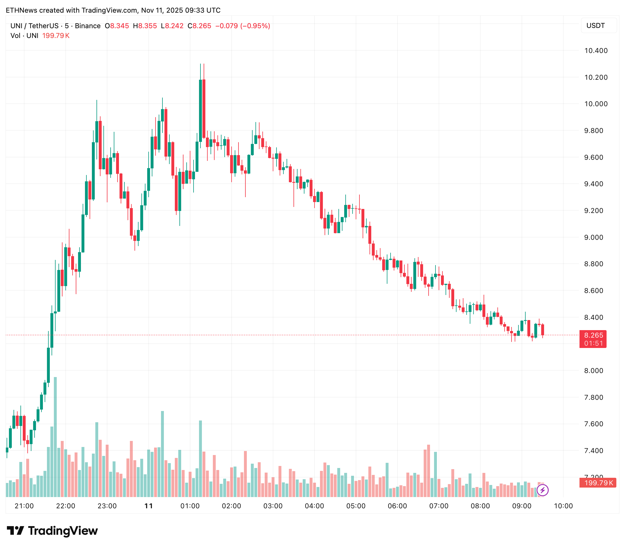 提案公布后,UNI交易量显著激增,价格一度突破10美元日内高点,随后在8.25-8.30美元区间温和整理。尽管存在短期波动,分析师认为这轮上涨属于结构性突破行情。