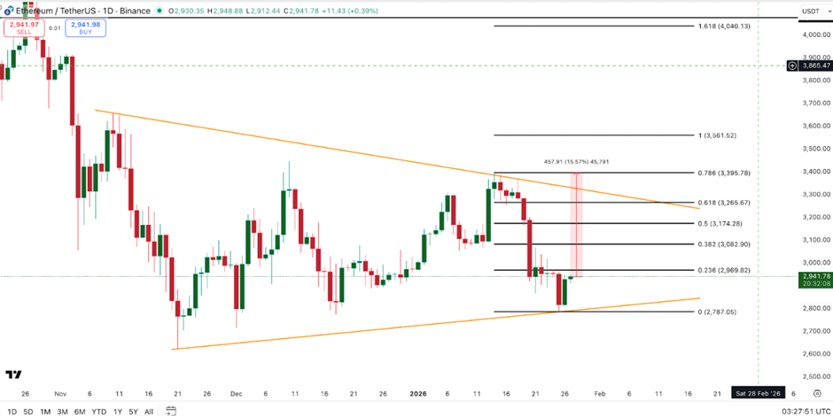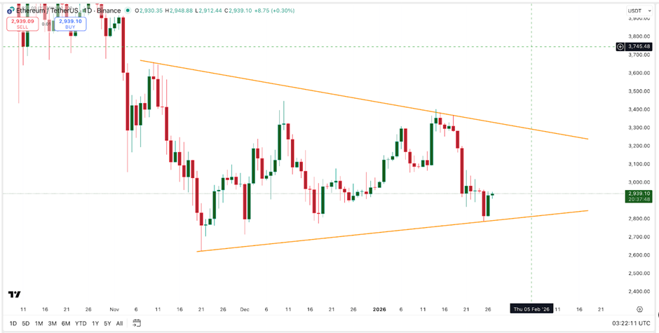 以太坊价格目前在2,930至2,950美元附近交易,数周以来波动不大。这种缓慢的走势并非刻意为之。自11月初以来,以太坊在图表上一直困于一个宽阔的三角形形态中。